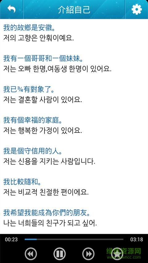 韩语教学机APP主要包含见面问候、互相告别、态度观点、居家生活等各方面日常实用韩语口语对话,并且具有真人朗读功能。无论是对韩语有强烈爱好的韩语迷,还是韩语专业的学生们,相信这个重在提升韩语交际能力的精心之作能助你的韩语更上一层楼!