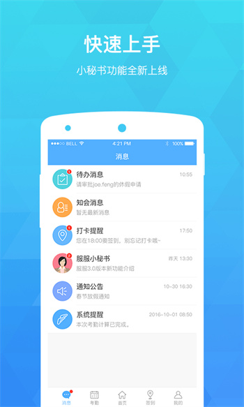 服服app是针对中小性企业提供的一款考勤软件,提供强大的考勤功能,一键定位签到不存在作弊现象,在线统计员工考勤信息一目了然,支持在线提交请假条、休假等功能,有效提高企业运转效率,欢迎来下载!