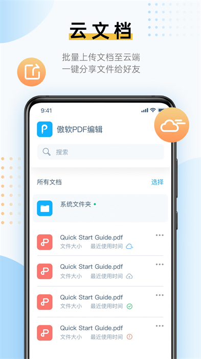 App不仅支持pdf文件本地编辑保存,也支持将文件上传到云端,方便存储内容并随时修改处理,即便切换设备也能轻松获取文档。同时,您可以将文档分享,方便工作沟通交流。文档太多怎么办?云文档同样支持搜索文档、选择文档和删除文档,帮您快速定位文档和管理文档。