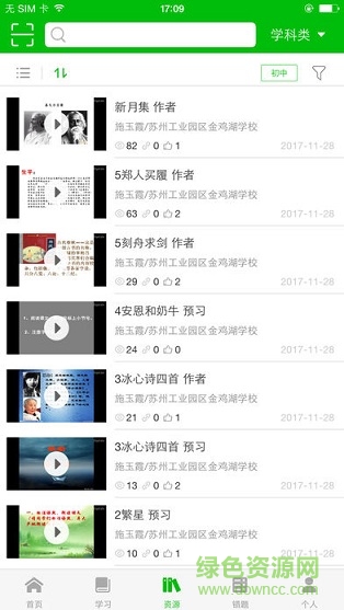 点击页面最下面一排主模块菜单的【资源】进入资源页面,分为学科类和特色类资源,包含视频、文档、测验、题库等资源。