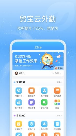 贸宝云专为外勤业务企业赋能及数字化转型的新商业Saas服务平台。针对外勤业务企业提供一站式数字化转型综合服务体系,打造即时办公通讯的高效协作产品。灵活的任务配置、高效的移动化办公、个性化数据舱,符合不同人群的使用需要。