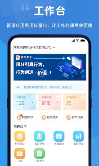 点赞积分软件安卓最新版中可以为企业提供积分管理服务,利用积分的方式对员工进行考核,公平透明,奖惩分明,可以查看自己的积分以及详细的积分排名,积分会实时更新,趋势一目了然,还可以直接在手机上完成考勤以及审核管理,喜爱的朋友赶快下载体验吧!