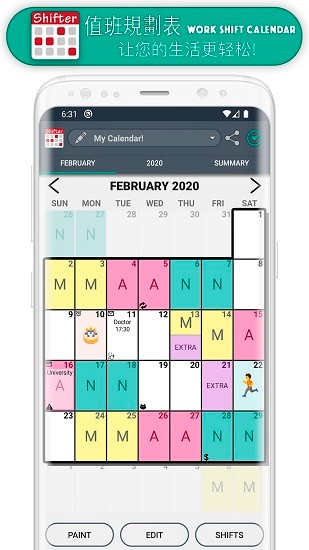 值班规划表shifter在这里无论是企业还是个人都是可以使用,帮助大家记录好日程,方便知晓自己的接下来的行程安排,在线日常排班可以时刻提醒自己的班次,不会错过任何的班次,同时还可以添加收入情况,可以帮助你统计所有班次的收入等,欢迎有需要的朋友下载使用!