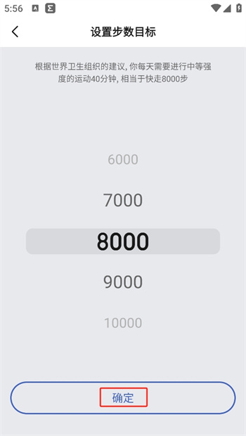 4、将当前界面中的步数通过上下滑动的操控进行目标选择,成功选中自己想要的步数之后,继续点击【确定】确认自己修改步数的目标。