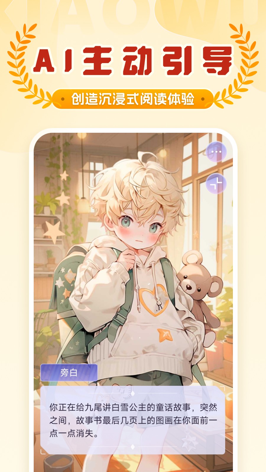 晓悟互动小说内置非常多的小说样本,在app内根据选择的小说不同,晓悟会为你讲解小说的内容,同时所有小说都是可以互动的哦,你可以作为主角参与到其中,感受不一样的精彩氛围,如果你对晓悟互动小说感兴趣的话,赶紧来下载吧!