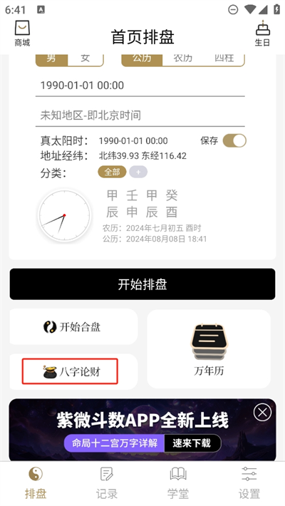 1、下载安装好应用后,进入首页排盘往下划就能看到【八字论财】了;