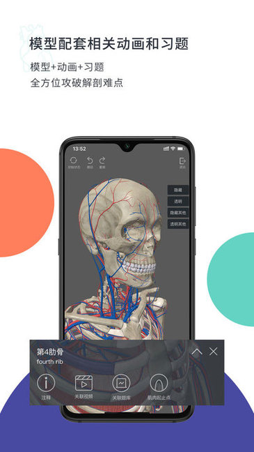 4000多个超高精度的3D人体模型,可360°观察,任意缩放、隐藏、透明人体器官如骨骼及关节,并配套专业的文字解释、肌肉起止点,并且每个模型都配套了相关的动画与习题。