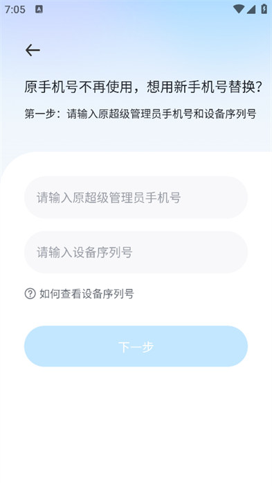 3、如果用户们要更换设备的话可以输入管理员的手机号和设备序列号去进行更换;