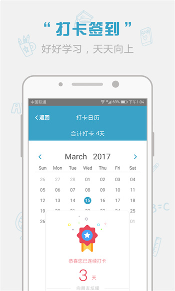 3.打卡日历:每日签到,记录学习情况,通过考勤,督促用户坚持学习。