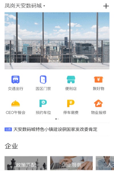 为企业和个人提供招商租赁、物业管理、安防门禁、智慧停车、园区服务、企业服务、在线缴费、日常消费、社交活动等服务。