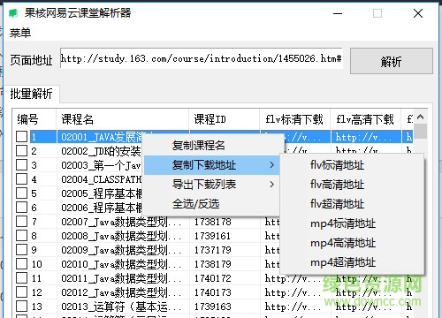 果核网易云课堂批量解析工具可以解析出flv,mp4标清,高清,超清下载地址,能解析收费的部分可观看视频下载地址。