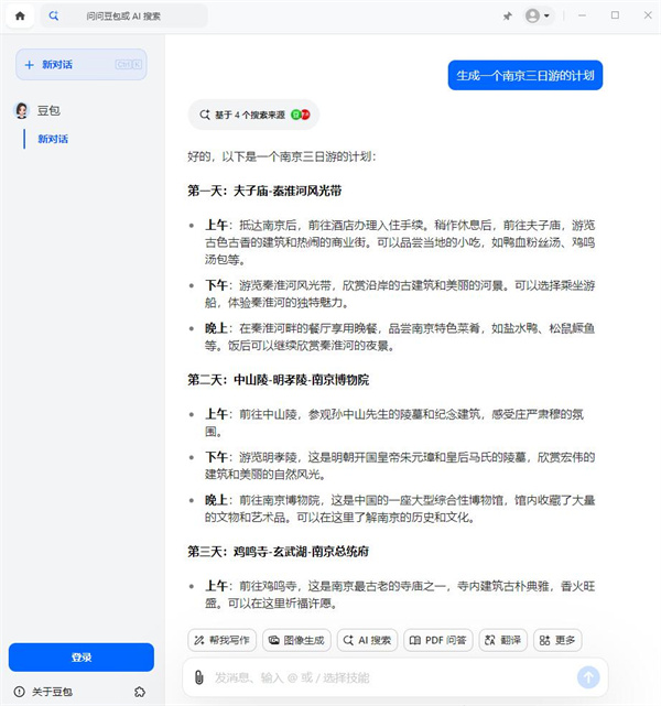 1、在软件中输入想要的内容,比如【帮助我生成一个南京三日游的计划】,就可以直接得到计划;