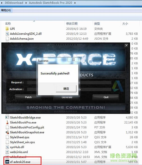 14.将注册机注册机xf-adesk20.exe复制在安装目录,点击patch打补丁,成功打补丁,如图所示。
