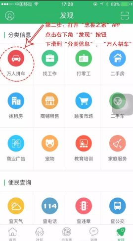 1.打开“忠县之家”APP点击“发现”按钮,下滑到“分类信息”,找到“万人拼车”