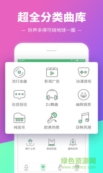 2.精细铃声分类,原创,翻唱,恶搞,影视,动漫,抖音网红热歌,流行金曲,影视热曲,动漫游戏,短信闹铃,DJ舞曲,搞笑另类,网络神曲,伤感语录,网友上传等