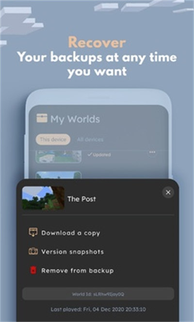 我的世界备份工具箱app是一款非常实用的手机游戏数据备份软件,能够帮助用户将游戏中的各种数据进行备份,在换机时能够将数据转移到另一个设备上,软件中还有非常多样的游戏工具,能够帮助用户享受更加舒适的游戏环境,还支持用户随时开启地图备份功能,帮助之后使用。