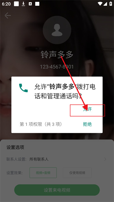 5、最后,只需要获取到设备的权限之后,就能顺利完成来电视频的设置。