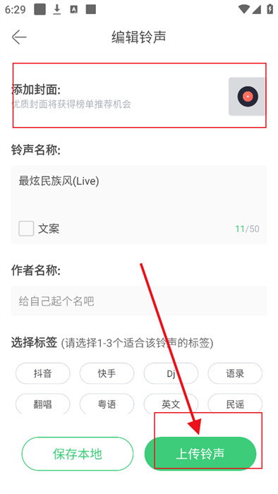 5、最后,只需要给音频增加一个封面和介绍,就能直接上传铃声。