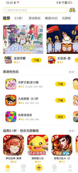 1、通过本站下载安装好软件后,点击进入软件,在首页我们可以看见有超多不同类型的游戏,有0.1折、即点即玩、云游戏等应有尽有;