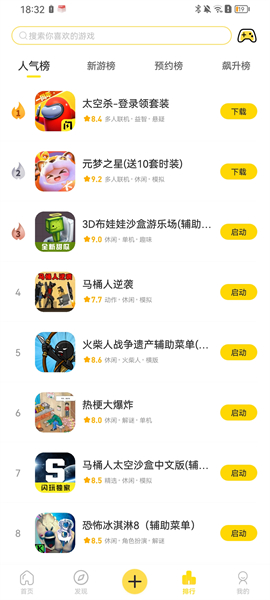 3、点击排行榜,分为人气榜、新游榜、预约榜、飙升榜等,大家可以通过排行榜栏目了解查看当前最新最热门的游戏;