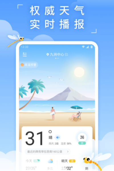 提供实时天气以及天气预报,天气预报24小时、新增地震预警 未来15天天气预报。实时温度计算空气质量指数、温度趋势、pm2.5等全面天气信息。提供穿衣、紫外线、舒适度等生活指数。帮助出差异地天气变化不会,简单快捷天气预报,为您开启每日彩云好天气,帮您美好生活小助手!蜻蜓天气新版本,使用了新的业界技术。不但充分照顾了老用户的使用习惯,而且性能更加流畅,网络速度更快捷,是一款资源消耗更小的天气社交软件。