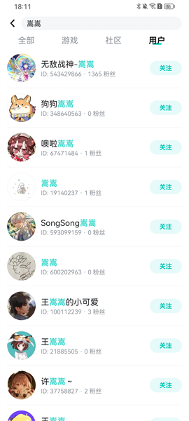 3、接着我们点击用户栏,就可以看见各种搜索结果,选择目标用户,可以直接点击 右侧的【关注】按钮;