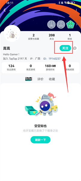 4、也可以点击头像进入主页,点击【关注】按键,即可关注好友,查看他的动态信息,以及发私信等操作。
