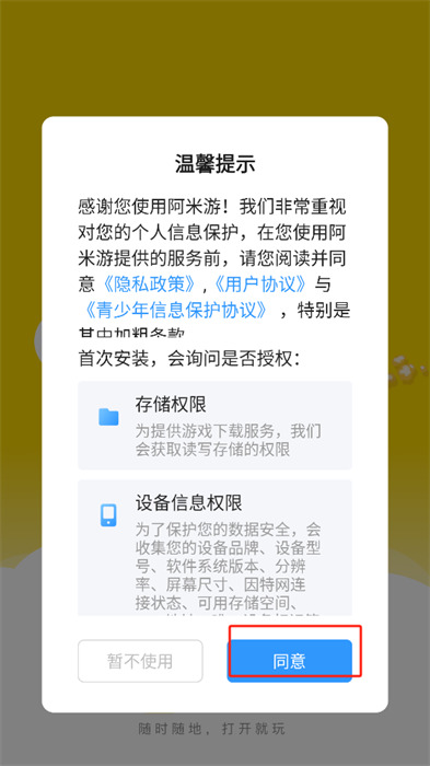 1、大家需要提前通过本站下载阿米游app软件,并直接点击进入,可以谈到隐私安全同意项目,点击【同意】即可进入,如下图所示;