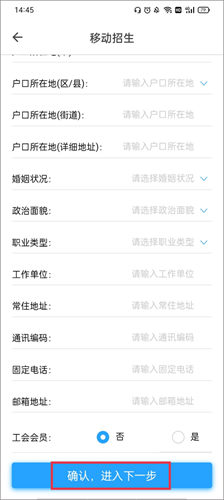 4、最后填写的是我们的身份证具体信息,例如户口所在地/婚姻状况/政治面貌/工作单位/常住地址/电话等,大家如实填写即可,接着就可以点击“确认,进入下一步”,即可进行志愿填报。