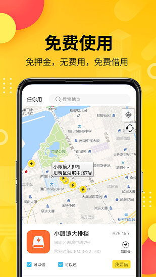 2、方便用户随时在线搜找附近的共享充电设备,通过任你用软件一键扫码支付使用。
