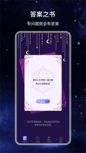 1、【答案之书】在心中冥想你想问的问题三次,然后点击查看答案,你就可以找到答案了;