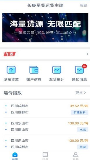 长庚星货运是一个网络物流服务平台,界面简洁,操作简单。主要集中混凝土、水泥、渣土、钢材,以及各种建辅材料等建筑类货物运输资源。货物运输发包方可快捷方便地找到承运人,承运人也可自由接单各种货运标的。货物运输完毕后,平台及时向承运人支付运费,向发包方开具运输增值税专用发票,方便无忧。