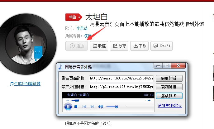 李荣浩的"太坦白",网易云音乐页面上播放按钮是灰色的,用这个工具获取到外链仍然能播放