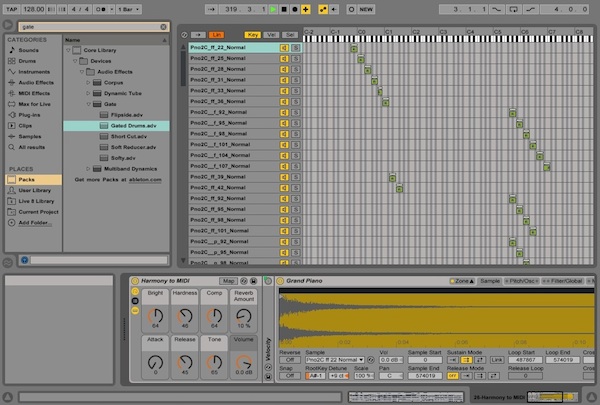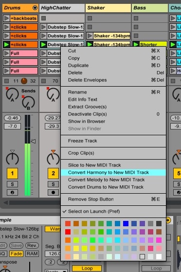 打击乐、音频旋律和音频和弦转换为MIDI是一个神奇的功能(如图10),之前Live其实已经有了打击乐音频转换为挂载Drum Rack的MIDI音轨的功能,大大方便了我们用已有打击乐和鼓loop进行改写的时间和难度,而这次更进一步可以将音频里的旋律甚至是和弦也转换成挂载Sampler采样器的MIDI(当然你也可以自己改成任何想要的插件来得到任何音色),就是说你现在Live 9可以帮你将任何音频的loop采样变成可以直接编辑的MIDI,然后你要调节音调、改写音符、改变音色都随你了(如图11、12)!