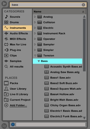 然后多出来的搜索框是这次最实用的改进了,你可以搜索任何关键字,不管是名称、分类、特征、tag等等都可以,然后Live会将一切相关的搜索结果按分类列出来,找素材和预置方便多了(如图5)。不过在Live Set以内的音轨名称、clip名称或设备名字依然无法被搜索到。