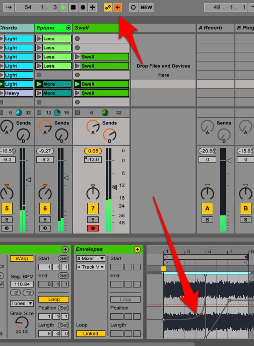 由于可以在Session界面里针对每个clip做automation了,于是在走带按钮旁边也多出了几个演奏时不同automation模式的按钮。如图8,那俩圆圈按钮按下表示可写入automation(相当于cubase里的W按钮),旁边的箭头按钮可取消写入的automation而继续用之前的。