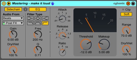 Live 9没有加入任何新的乐器模块(不算Max for Live的新模块)让人惋惜,不过他们在效果器方面做出了一些改进。首先是唯一的一个新的效果器Glue压缩(如图13),这是一个按照上世纪80年代某著名大控台物理建模而成的压缩器,还内置了EQ和旁链输入,那个首次出现在Live里的VU表控件界面有点诡异啊感觉?