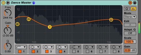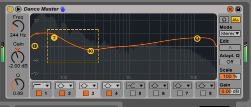 然后以前内置的Comprssor压缩效果器、EQ Eight均衡效果器、Gate门限效果器也有改进,最主要体现在EQ增加了叠加在EQ曲线图之上的频谱(如图14),这是当前的流行趋势,调节起来更顺手,另外现在还可以直接在曲线图上圈选多个EQ点来调节了(如图15、16)。