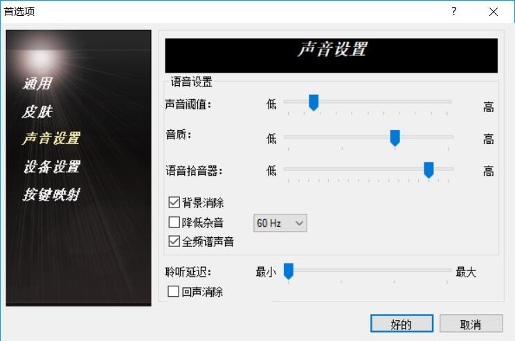 声音阈值: 它决定变音之前声音的大小。背景噪音越多,阈值级别就需要越高。高位级别能保证背景噪音不会被变音。但如果太高,语音变音会失真不当。默认为低。