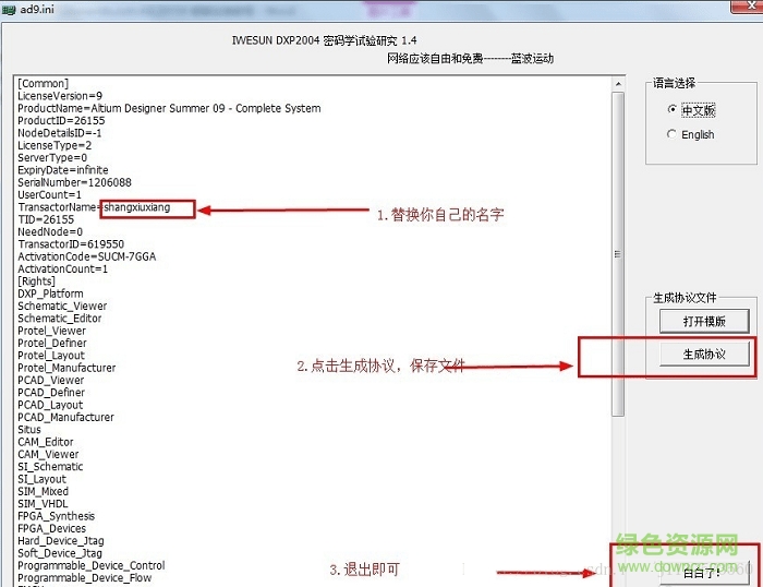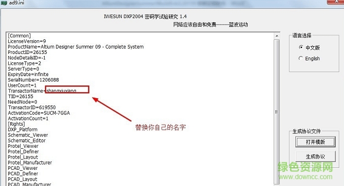 11.开始修改了,打开”AD9.4.0.20159修改补丁“文件夹,找到AD9KeyGen运行,然后点击“打开模板”,加载ad9.ini,如想修改注册名,只需修改: