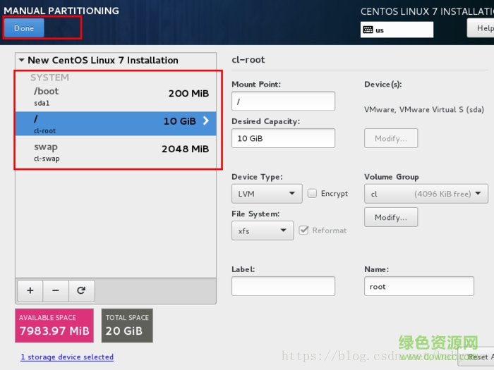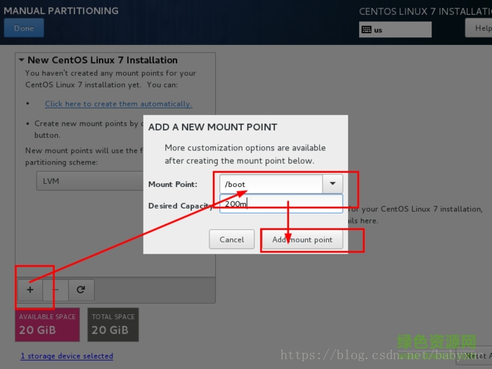 20.如下图所示,点击加号,选择/boot,给boot分区分200m。最后点击add