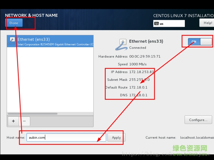 24.首先要打开网卡,然后查看是否能获取到ip地址(我这里是桥接),再更改主机名后点击done。