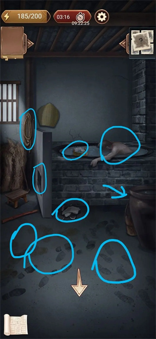 一捆麻绳,黄酒,灶中余烬,布鞋,布鞋脚印,皮鞋脚印,奇怪的脚印,奇怪的姿势(注意这里一共有三个脚印,如果收集不全后期柴房会卡在95%,看广告都没提示,太草了)