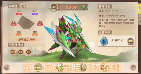 3、第三位是螳螂,位列种族值第二的精灵,是当之无愧的六边形战士,且形象十分的帅气;