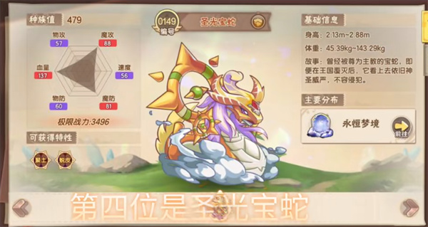 4、第四位是圣光宝蛇,可攻击可防守,亲民度很高的一个精灵;