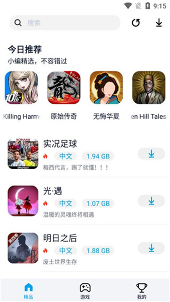 1.首先我们点击软件进入软件主页,在精品页面中可以看到一些比较优质的游戏推荐,往下滑还能发现更多的游戏资源,看到喜欢的可以点击右侧的”↓“符号下载;
