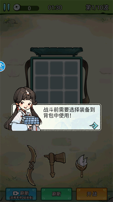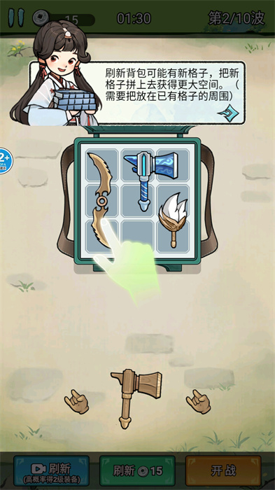 2、把武器放在背包中,就可以开启战斗,但是需要合理的放置,因为需要把三个武器全部都放进去,装备好装备之后就可以开启战斗;