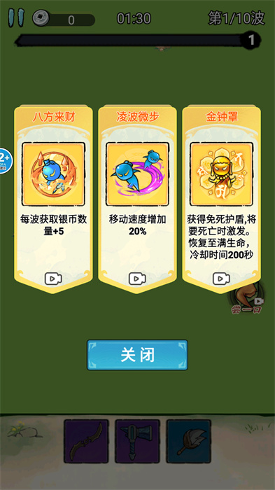 3、在战斗之前,可以看广告获得一个游戏BUFF加成,但是一般不需要,我们只要点击【关闭】就行;