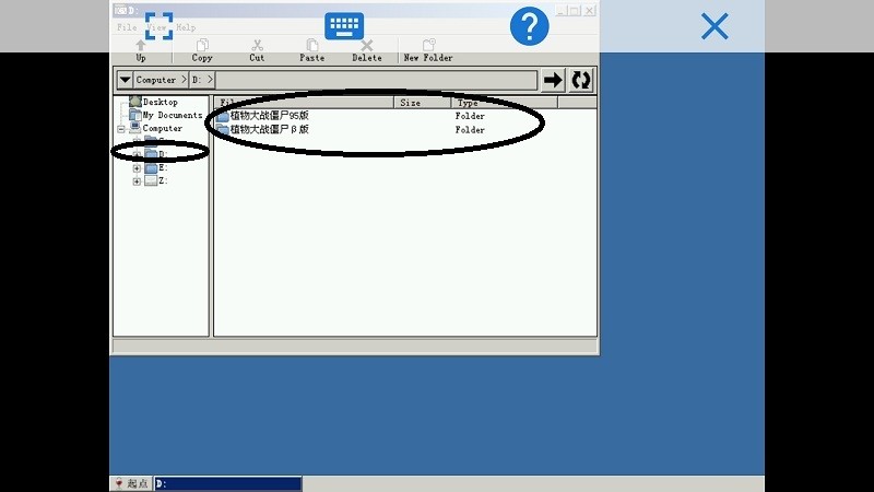 第五步、点击左侧的d盘文件夹,选择自己要玩的版本,蓝色光标标注的文件双击就可以进入游戏,第一次启动需要输入名字,因为模拟器字库会丢失一部分,输入的名字会看不到需要滑动alt下面的按钮随便输点击弹出窗口左边的方框即可