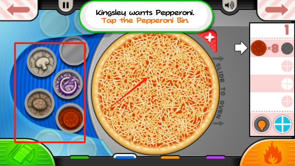 2、放好披萨后需要放好材料,材料就在披萨的旁边,点击材料进行摆放吧;